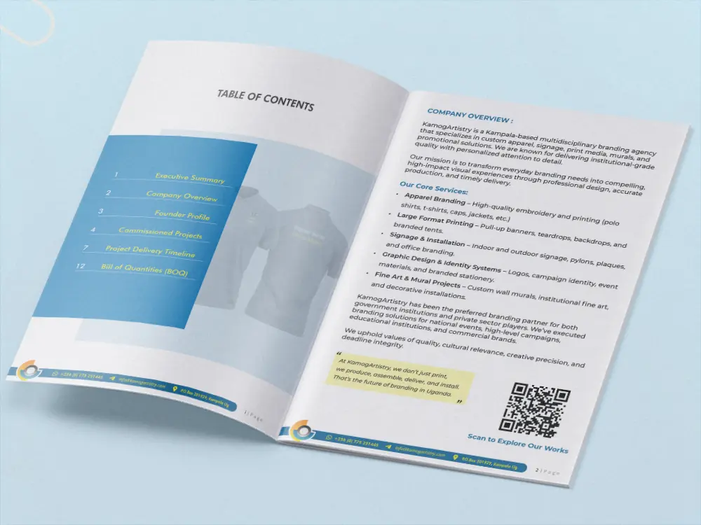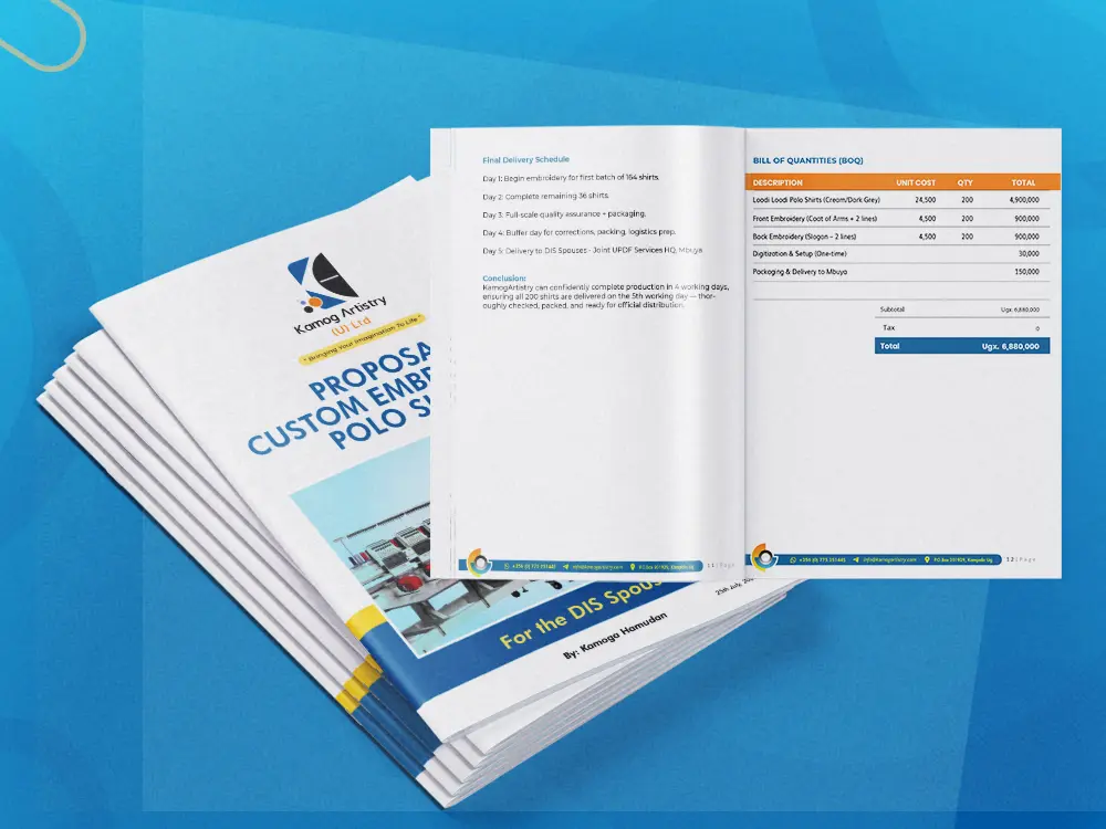 A strong proposal is more than text placed into a document. It is a business communication tool. In Kampala, proposals are used in formal procurement, partnership discussions, investor presentations, supplier submissions, client pitches, donor engagement and project bidding. That is why we design proposal documents to feel organised, readable and credible from the beginning.