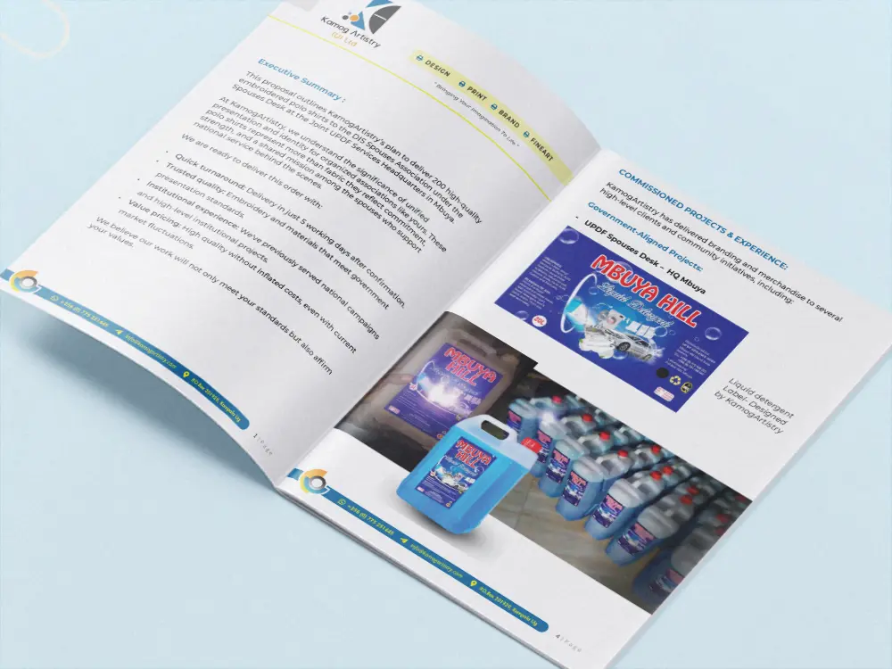 This gallery helps show how we structure formal proposal documents in Kampala, from covers and section dividers to interior content layouts and polished presentation-ready outputs. If you need related support beyond the proposal itself, explore Company Profile Design Kampala, Presentation Design Kampala, Report Design Kampala and Brochure Design Kampala.