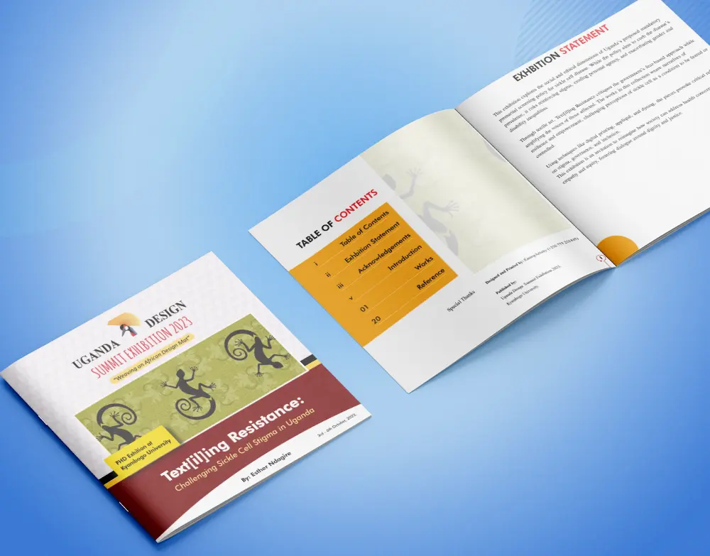 These visuals show a professionally designed publication for the Uganda Design Summit Exhibition 2025, including the catalog cover, table of contents pages, printed copies, interior editorial spreads and the finished back cover. Click any image to open it full on this page.
